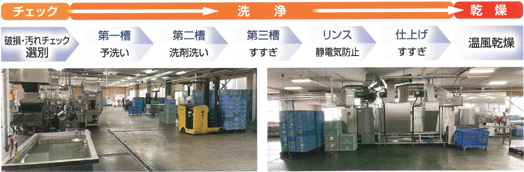 従来のコンテナーを伏せて流す伏せ型タイプの洗浄乾燥機と新規導入のコンテナやトレーを立てて流す縦型タイプの洗浄乾燥機の2種類の機械設置しコンテナのサイズや形状、汚れ具合等により使い分けが可能。