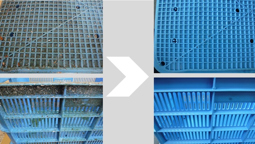 こびりついた油汚れのコンテナ、魚や肉の汁がついたカゴもこんなにキレイになります。