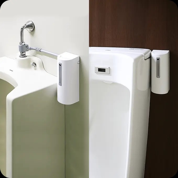 小便器の水が流れるたびに除菌洗浄剤が流れ、配管の詰まりや悪臭の原因となる尿石の付着を防ぎ便器をキレイに保ちます。アップル&ローズの咆哮機能付き。