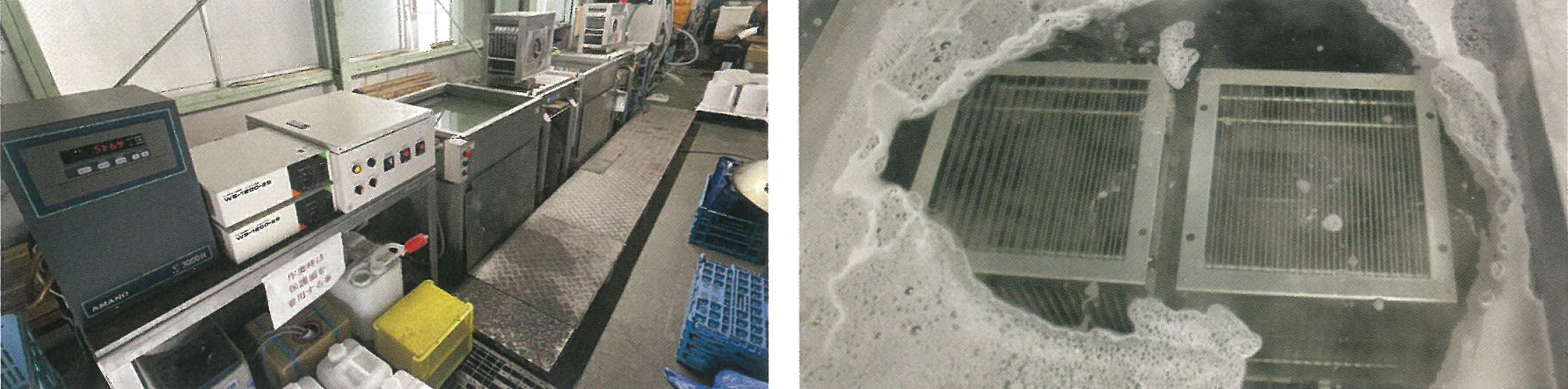 アルカリ電解水を使用しているため、通常の水を使うよりも洗剤の使用量が少なくて済み、洗浄するワークに対するダメージを通常よりも抑えることができます。また、超音波の振動子も2基設置されており、入り組んだ部分や狭いところにこびりついてしまった汚れも、取り除くことができます。